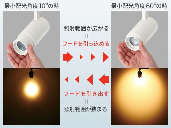 フードを引き出したり、引っ込めるだけで簡単に配光角(照射範囲)を狭角10°~広角60°まで調節できるため、レイアウト変更のストレスを軽減します。